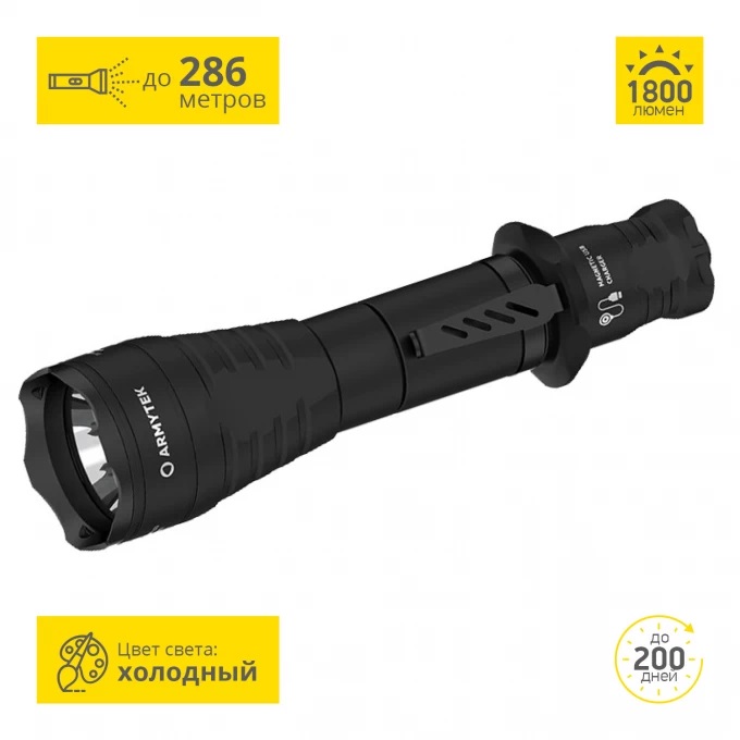 Благодаря силиконовому грип-упору и тактической кнопке в задней крышке Viking Pro удобно использовать одной рукой. Модель совместима с оригинальными цветными фильтрами и выносными кнопками, а также с любыми универсальными подствольными креплениями.