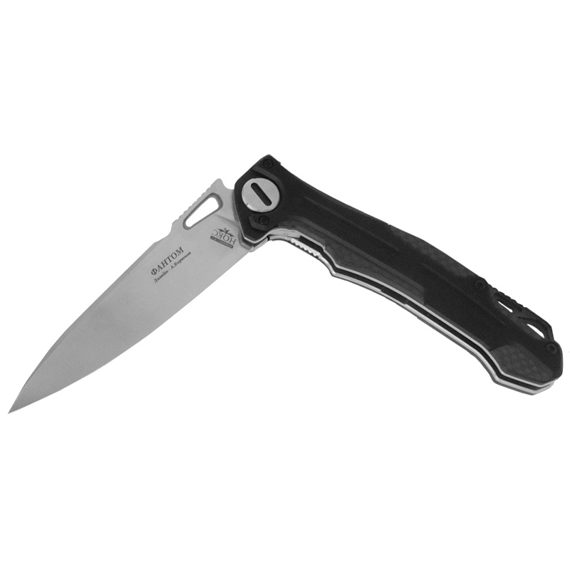 Складной нож Фантом Нокс - продолжение ножей линейки серии Т авторства Александра Бирюкова. Длинный клинок сделан из высокоуглеродистой инструментальной легированной стали Д2. Обратите внимание на его форму, так называемый «тройной клин». Во всех трех проекциях он представляет собой треугольник и это неспроста, подобная геометрия оптимально сочетает отличные режущие свойства и возможность нанести мощный акцентированный укол. «Тройной клин» был проверен и прекрасно зарекомендовал себя на уже получившем широкую известность ноже «Майор». «Фантом» стал развитием идеи, он сам по себе столь же удобен, компактен и маневренен, однако клинок стал длиннее на целый сантиметр! Осевой узел выполнен на подшипниках, благодаря этому нож с легкостью открывается одной рукой двумя способами, по выбору владельца - флиппером или при помощи отверстия на клинке.
