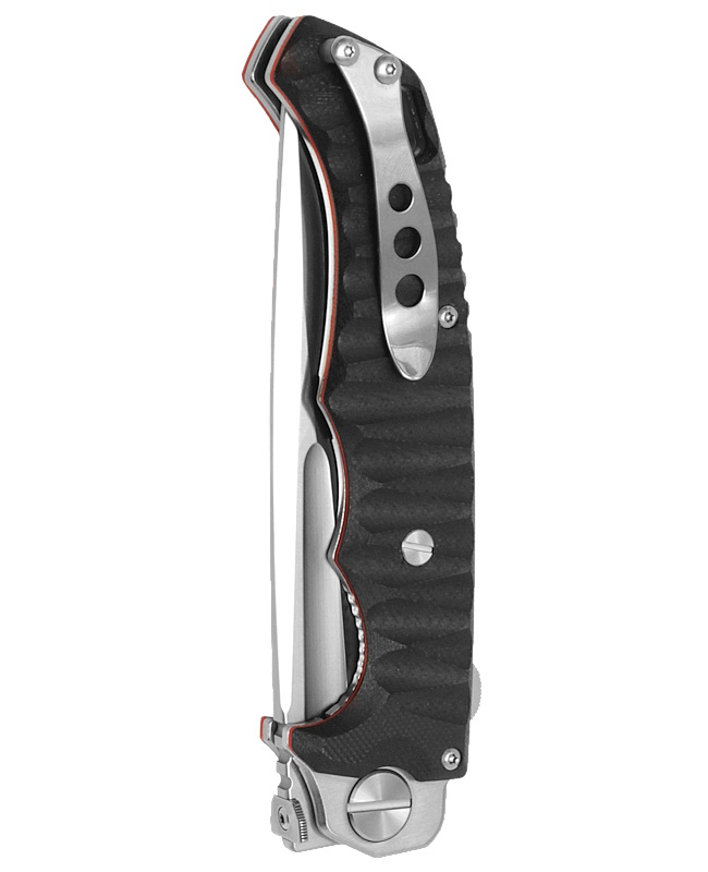 Удобная рукоять с накладками из высокопрочного пластика G10 черного цвета и изящными красными вставками прекрасно смотрится на фоне стального клинка. Трехмерный рельеф поверхности обеспечивают надежный и комфортный хват и цепкое удержание в мокрой руке. Надежный замок гарантирует безопасность работы.