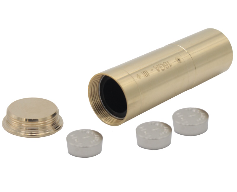 Установите три элемнта питания в корпус лазерного патрона плоской стороной (положительный полюс "+") к крышке батареи.
