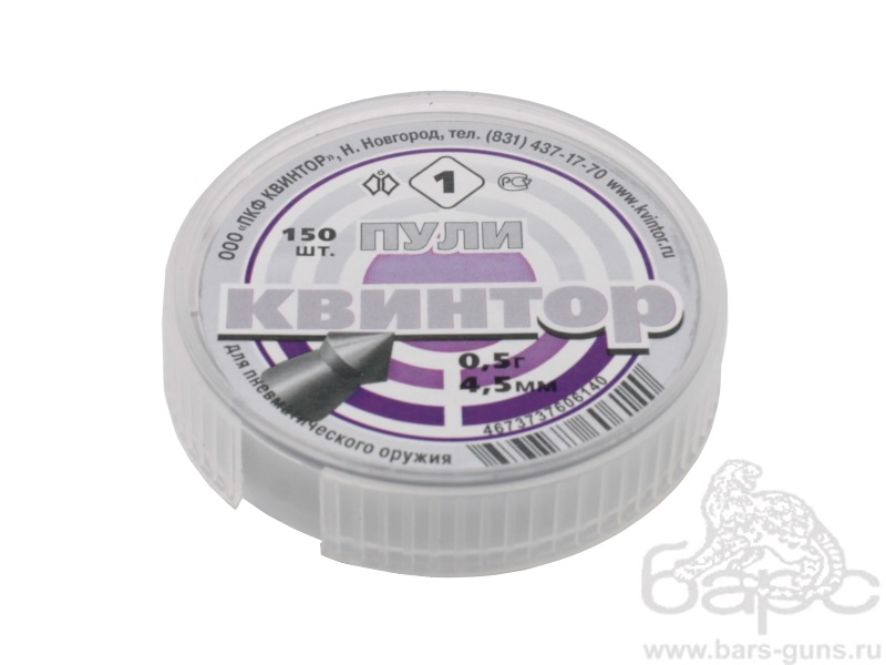 «Квинтор» — штампованные свинцовые пули с остроконечной формой головной части. Эта особенность строения значительно увеличивает степень ее проникающей способности. Пули имеют высокие показатели скорости (в полете) и неплохую кучность попадания в цель. Подходят для моделей пневматического оружия различной мощности, пользуются у охотников особой популярностью.