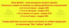 Скидку действует по промокоду "Мы "любим" футбол", который необходимо заявить до оплаты покупки. Заявленный размер скидки действует только в указанный период. Продавцы-консультанты не обязаны информировать покупателей о действии скидок