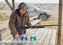И вот подошёл третий, наиболее интригующий этап стрельб с патроном Vega Sport 12/70 «Азот», с навеской 28 г дроби № 7,5. Это один из основных типов патронов для выполнения упражнения компакт-спортинг стендовой стрельбы. Кроме того, он часто используется на различных охотах на пернатых. Кстати, в этом патроне «Азот» использует порох отечественного производства, а сам патрон по своим характеристикам и соотношению «цена—качество» оказался широко востребованным на рынке. Не смотря на то, что подавляющее большинство ружей с инерционным затвором надёжно работают с патроном 28 г, мы были готовы к любым сюрпризам — ведь у нас в руках была незнакомая модель. Но уже первые четыре серии по три выстрела, а затем и полная серия из шести выстрелов показали, что ружьё надёжно перезаряжается как при стрельбе по горизонту, так и в зенит.